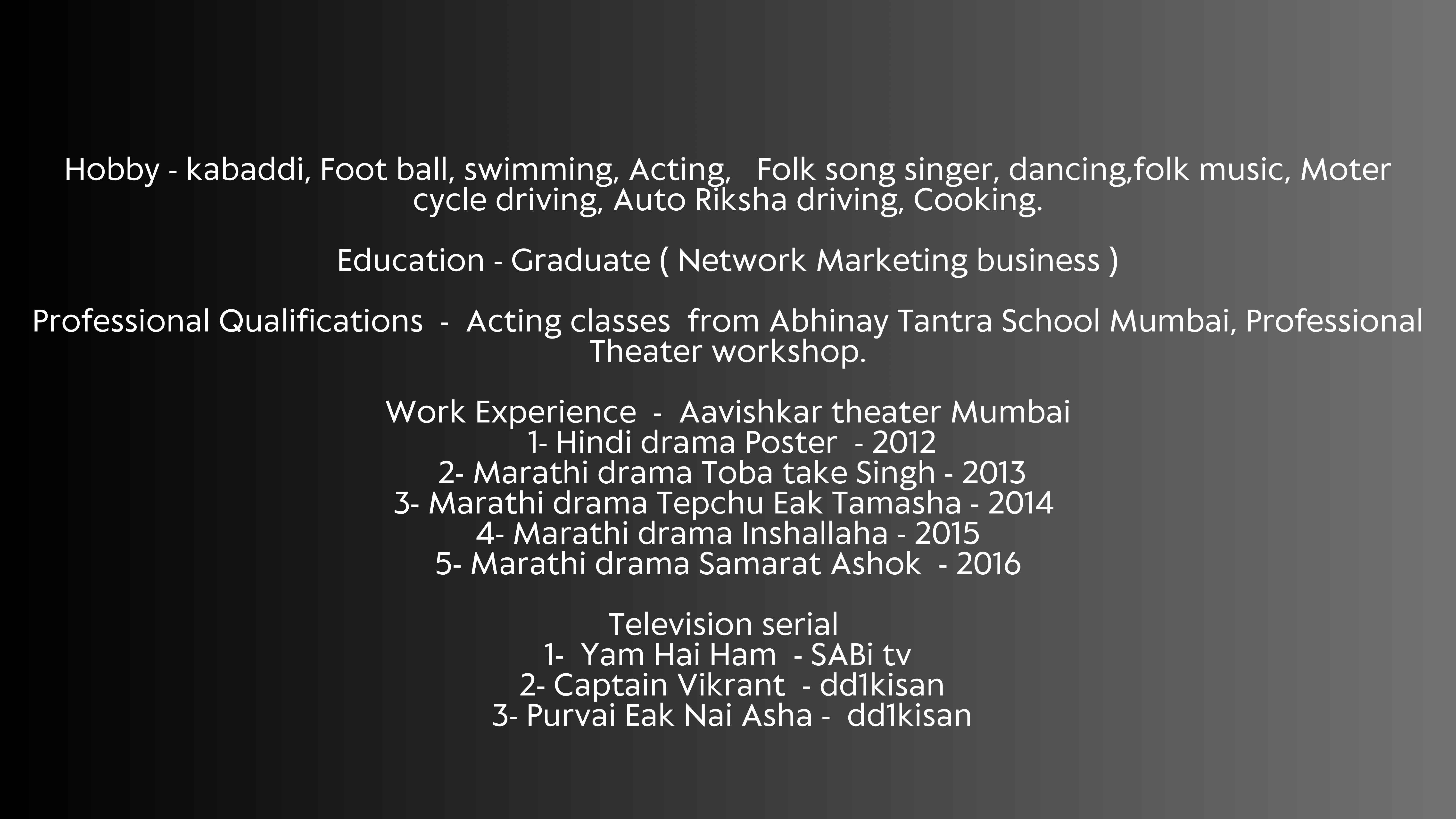I am an actor in Indian Film Industry, I have done few Films, Serials and Theaters till now. I am open to work in any good Project.