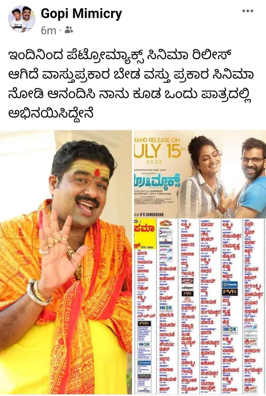 1.Sidlingu (lose mada yogi starer ), 2. super, (Upendra), 3. Mr. 420 (Ganesh ), 4.Jaggudada (Darshan), 5. Rajvishnu (Sharan ) , 6.Namobhootatma (Komal ) , 7.Melkote manja (Jaggesh), 8.Thotapuri (Daali Dhananjay), 9.Myaatni (Ninasam Satish ), 10.maarigold (Diganth ), 11.Timmaya n Timmaya (Ananth nag ), 12 Nan Magle heroien (Sanchari Vijay ),