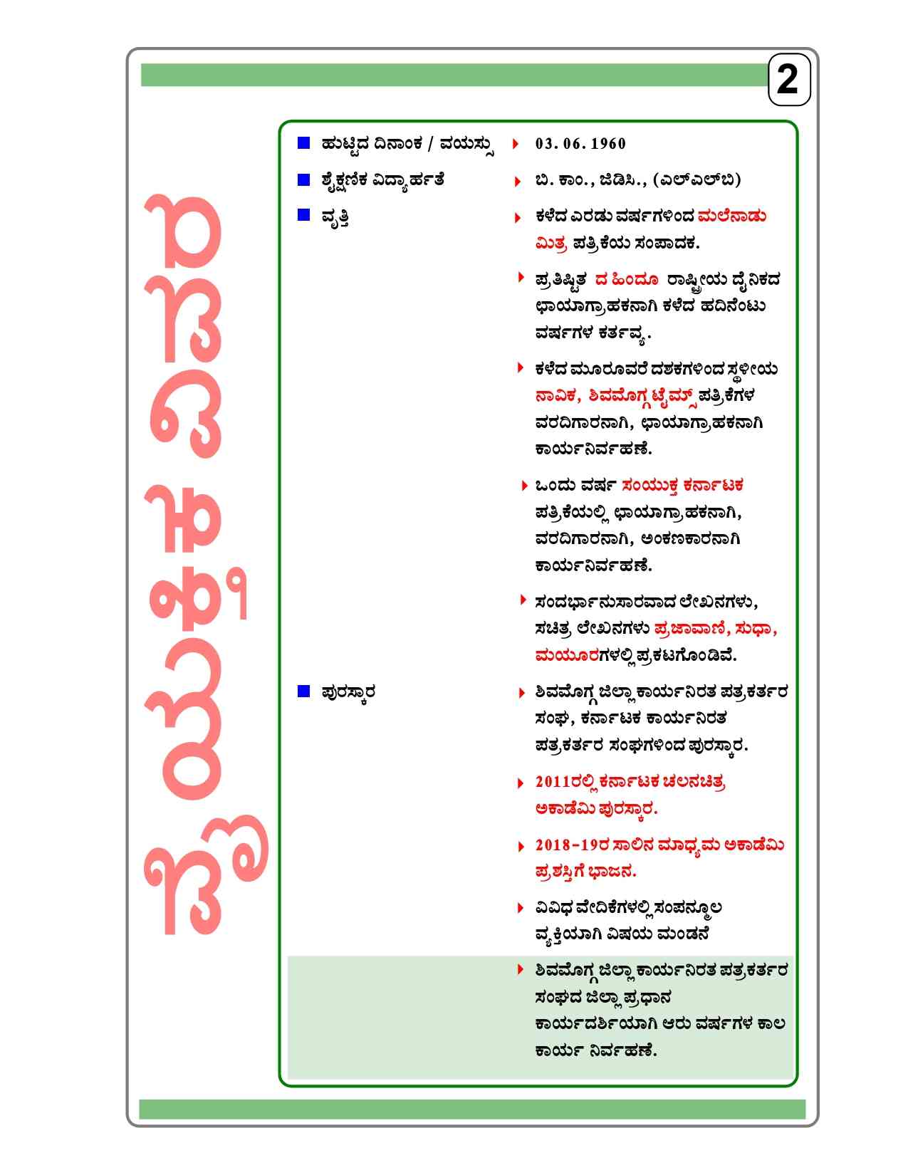 I am an actor in Kannada Film Industry, I have done many Films, Serials and Theaters till now. I am open to work in any good Project. My notable works are Akashmika, Santha shishunala sarifa, Mysore mallige, Neela, Allama, Sihi muttu, Lift Kodla, Dwaja, Mathadana, kanunhegadathi, Jog Falls, Olle monk Swamy etc.